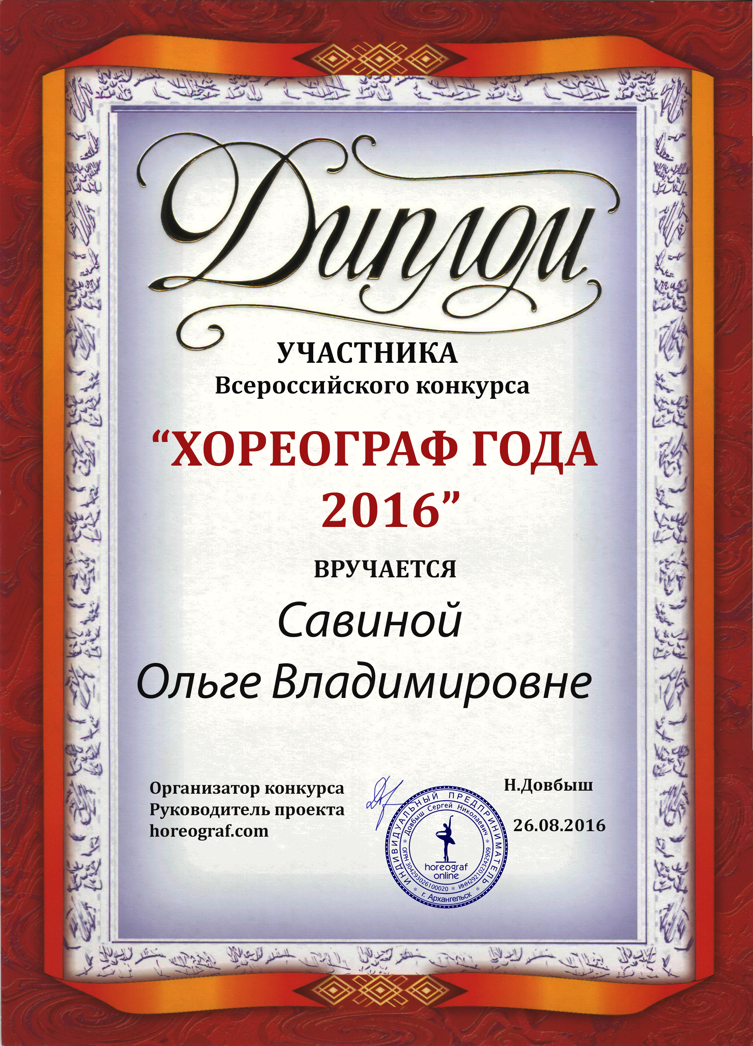 Сертификат от Horeograf.com Москва 2018 г. « Основы современного танца», « Методика современного танца для детей» (16 часов)
